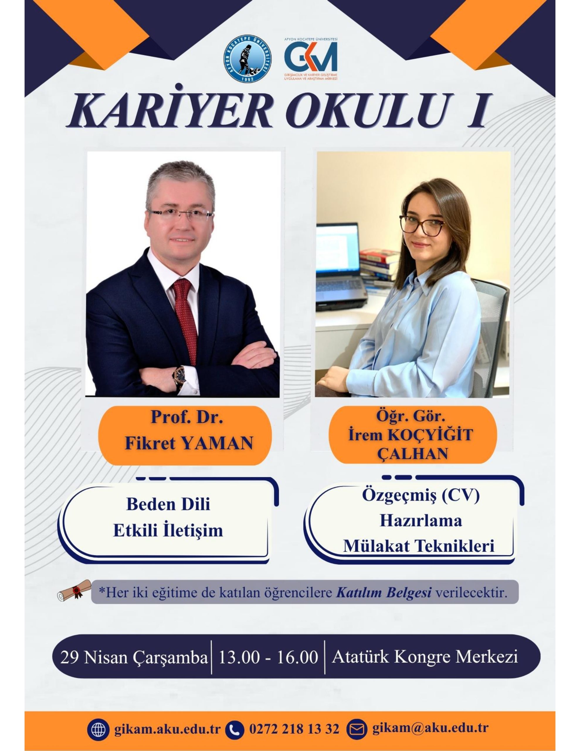 Eğitim kapsamında beden dili, etkili iletişim, özgeçmiş (CV) hazırlama ve mülakat teknikleri konuları ele alınacaktır. Her iki eğitime de katılım sağlayan öğrencilere “Katılım Belgesi” verilecektir.